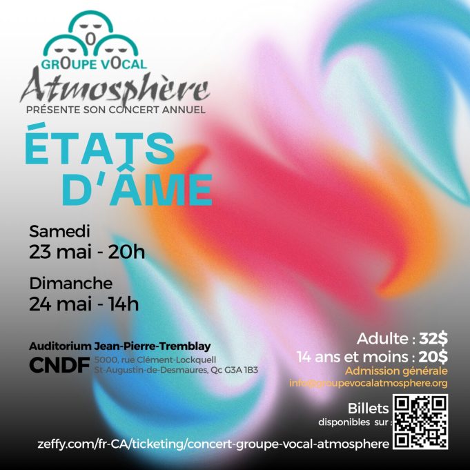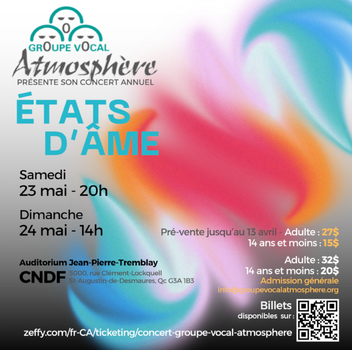 L e Groupe vocal Atmosphère est une grande équipe d'une cinquantaine de choristes à six voix qui s'unissent afin de vivre le chant choral pour le plaisir, l'amitié,la passion et pour offrir un concert annuel de haut niveau pour le plus grand plaisir de notre public.